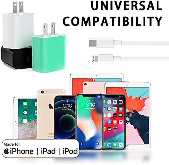 3 Pack [Apple MFi Certified] iPhone Charger 20W PD USB C Wall Fast Charger Adapter with 3 Pack 6FT Type C to Lightning Cable Compatible with iPhone 13 Pro/13/12/12 Mini/12 Pro Max/11 Pro Max/XS Max/XS