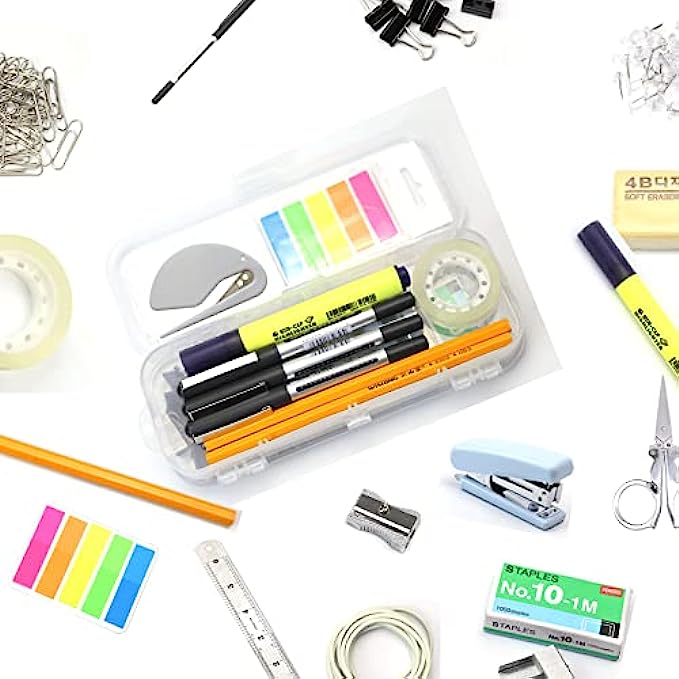 ALL IN ONE OFFICE KIT: you will find all the common office supplies from this little box, includs Binder Clips*12, Sharpener*1, Paper Clip*80, Stapler*1, Staples*1000, Rubber Band*12, Eraser*1, Clear Push Pin*18, Letter Opener*1, Page Marker*5, Steel Ruler*1, Pencil*2, Highlighter*1, Black Pens*3, Steel Scissor*1, Clear Tape*1,Clear Pencil Box* 1