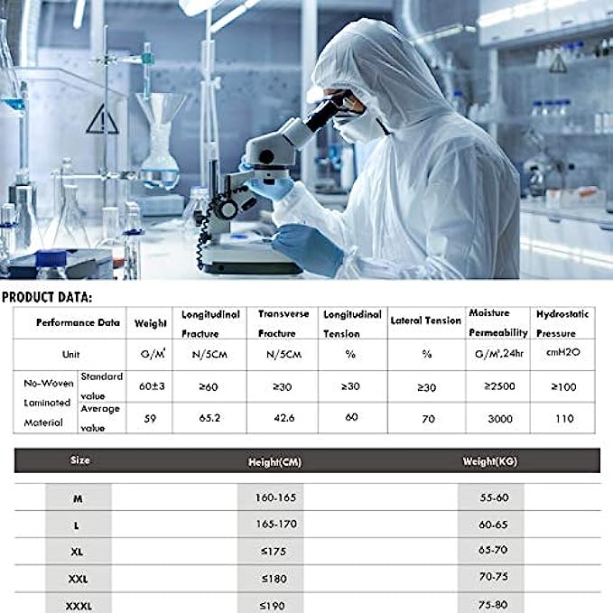 • ▷ABSOLUTE PROTECTION- High density materials of coverall fabric offers an inherent barrier to small size particles,include dry particulates and fluid.Anti-static coating on both sides helps reduce static build-up and prevent the risk of static discharge during use.