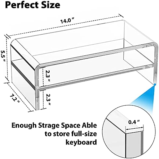 • 【2 TIERS STORAGE SPACE】The acrylic desktop computer monitor riser has 2 tiers of open storage space, both of which are 2.3 inches high. When you use a computer, you can place your phone, mobile hard disk, etc. on the mezzanine of the monitor riser. The clear computer monitor stand allows you to never miss a message.