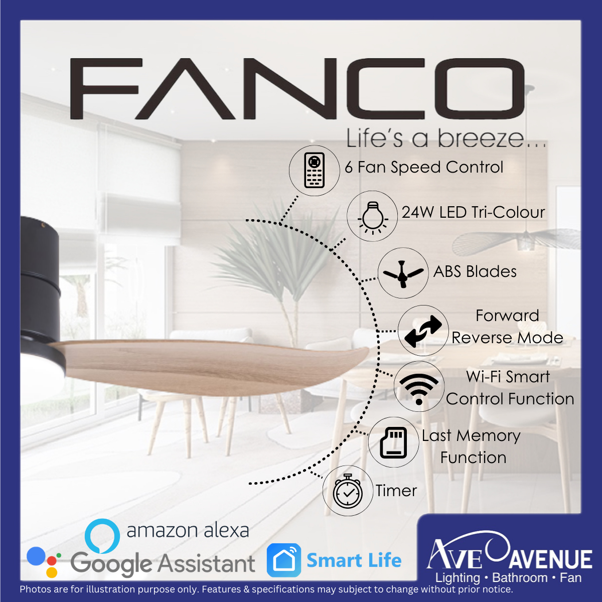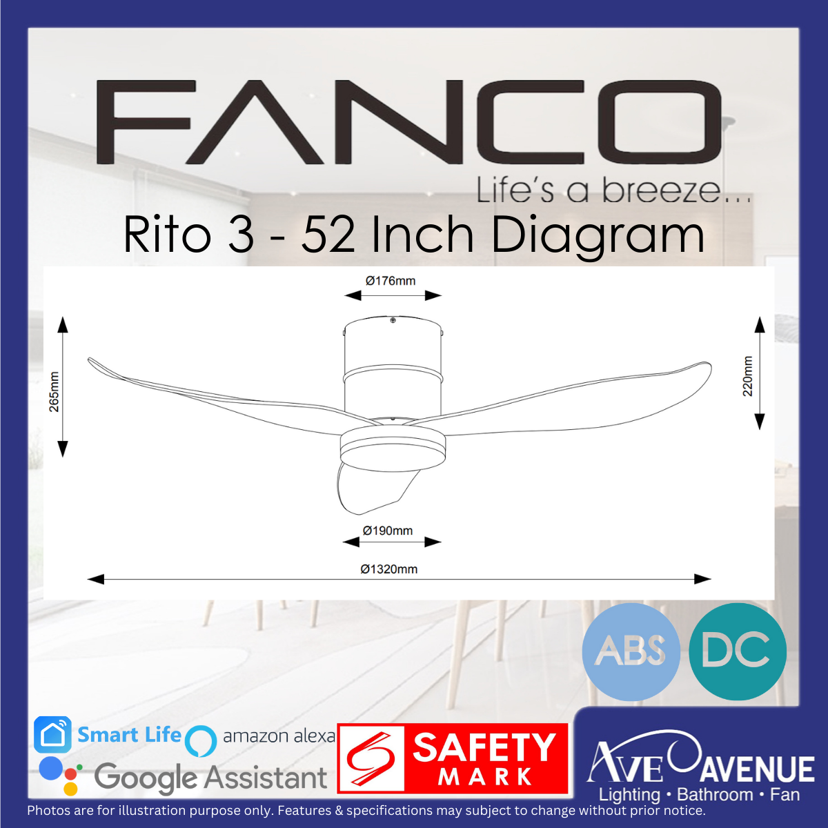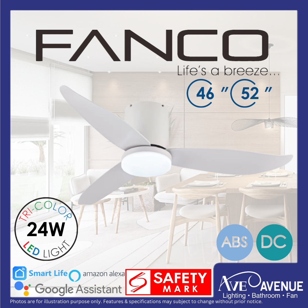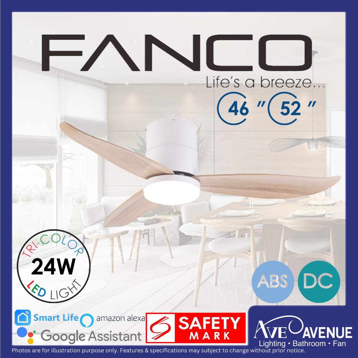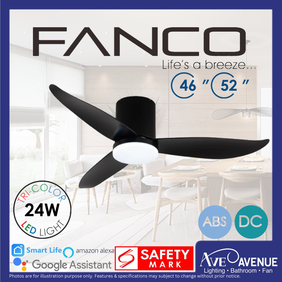 FANCO CO-FAN Rito-3 SMART DC Motor 46/52 inch 3 Blade Ceiling Fan w/ 3 Tone LED Light and Remote Control or Smart Apps