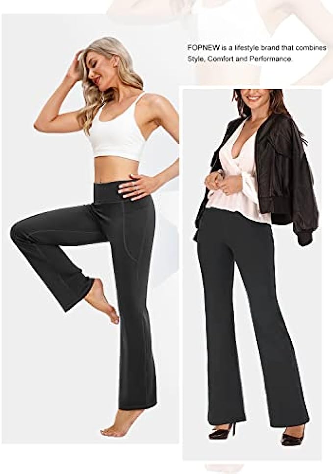 73% polyester 27% spandex ULTRA-SOFT MATERIAL: Bootcut workout pants(Upgrade) for women are made from materials with 73% Polyester & 27% Spandex premium butter. Super stretchy and soft, large proportion polyester retains its shape and is very durable, easily washed & dried. HIGH WAIST & TUMMY CONTROL: Yoga pants a High-Rise Waistband with Tummy Control design, it won't roll down even you do a wide range of movement, 4-way Stretch material that promotes both compression and support. Sweat-wicking, Non-See-Through and make streamlined look. Perfect womens dress pants. FUNCTIONAL THREE POCKETS: The bootleg pants with 2 side pockets & 1 waistband pockets are ideal for keeping your cards, keys, etc. while you're on the yoga or working out at any places. 2 side deep pockets can fit a large smart phone can let you move, squat or do any poses in your exercises. UNIQUE DESIGN: Design your own work pants that suit you best, whether you’re tall or petite, slim or plus-size or anyother. You can alter these yoga pants to your preferred inseam length all on your own; find two symmetrical marks at the bottom of the flare pants and trim. Don't worry, they won't lose their bootcut shape in the process. VERSATILE SCENES: If you're looking for even more cozy pieces for your closet, workout pants would be your Best Choice either for work, casual or daily wear, yoga pants for women can be matched from high heels to flat shoes, from office to yoga classroom, so that both your work, life and exercise can be connected seamlessly.