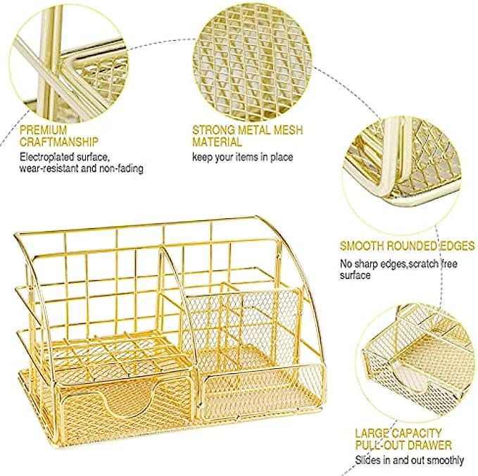 • 【Elegant Desk Organizers】Our cute and stylish desktop organizer features 5 separate compartments and 1 mini sliding drawer. The desktop organizer is adopting with a powder coat finish and electroplating technology ,wear-resistant, anti-oxidation, and long lasting and does not fade . The rounded corners metal rim and trim add to the visual appeal, and protect your desk.