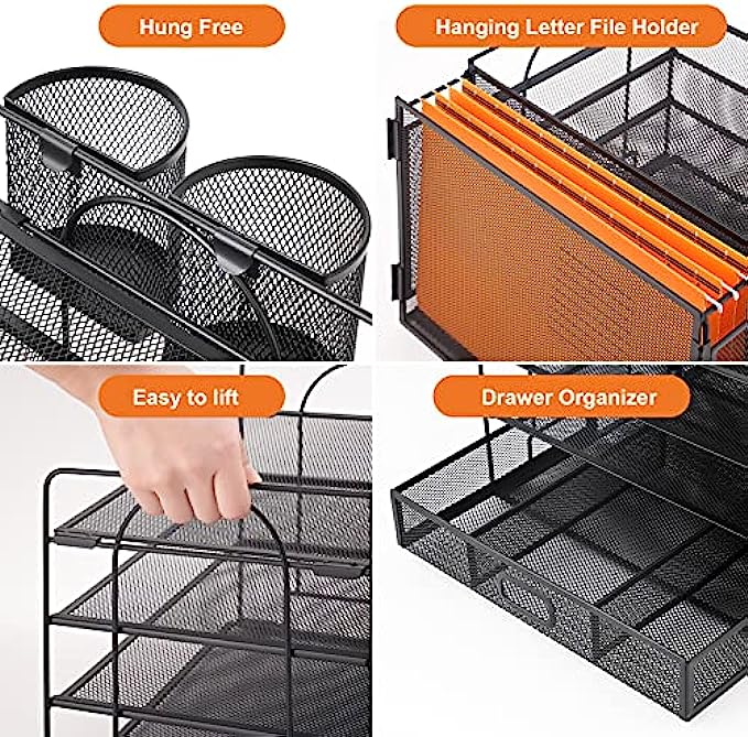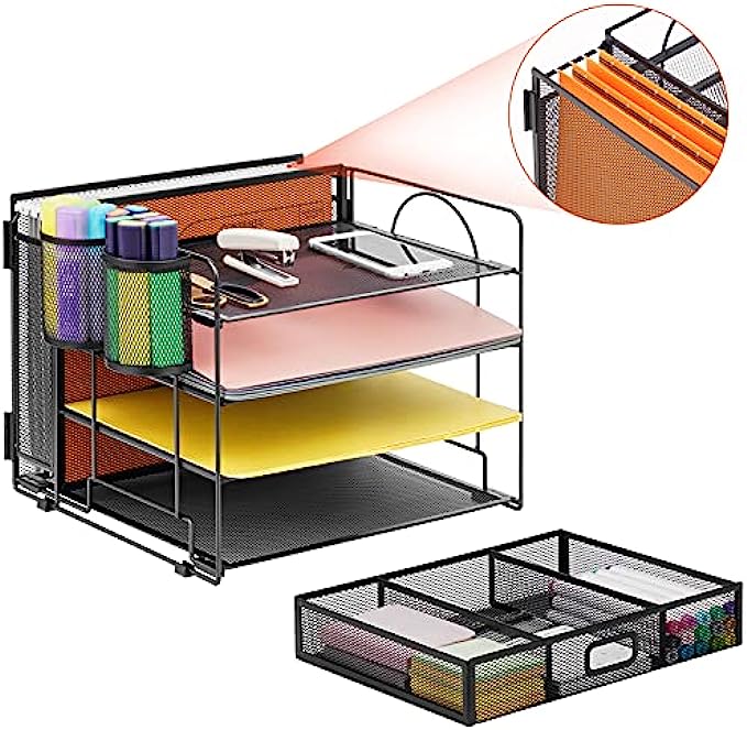 • 【Perfect Desktop File Organizer】Our Office Desk Supplies Organizer is made of 4 sliding trays + 2 Hanging Pencil Holders + 1 sliding drawer which has enough storage space to accommodate all office supplies, such as pens, pencils scissors, folders and Letter/A4 Size Paper