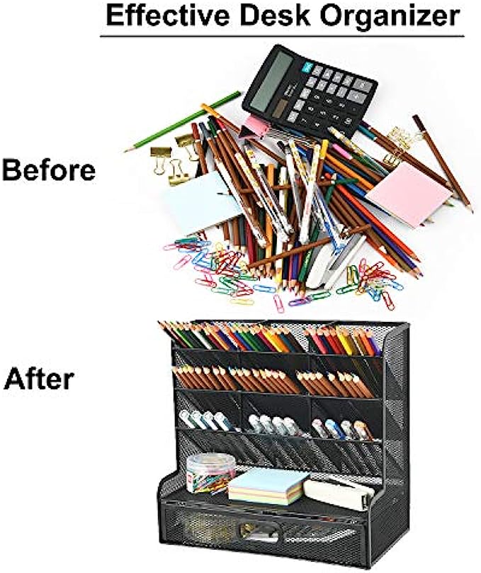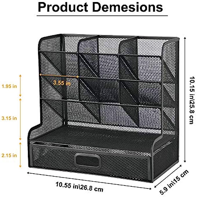 Marbrasse Mesh Desk Organizer, Multi-Functional Pen Holder, Pen Organizer for desk, Desktop Stationary Organizer, Storage Rack for School Home Office Art Supplies (Black Mesh Pen Holder with Drawer)
