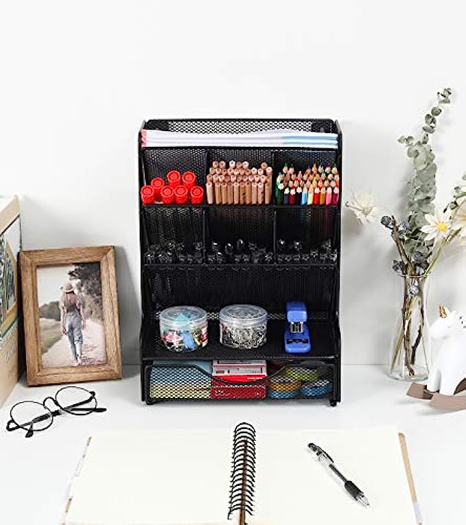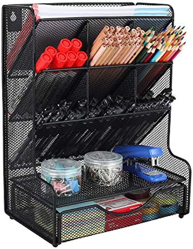 PAG Desk Organizer with Drawer Office Supplies and Accessories Storage Caddy Hanging Wall Shelf Metal Mesh Pencil Holder for Kids, 9 Compartments, Black