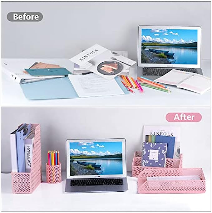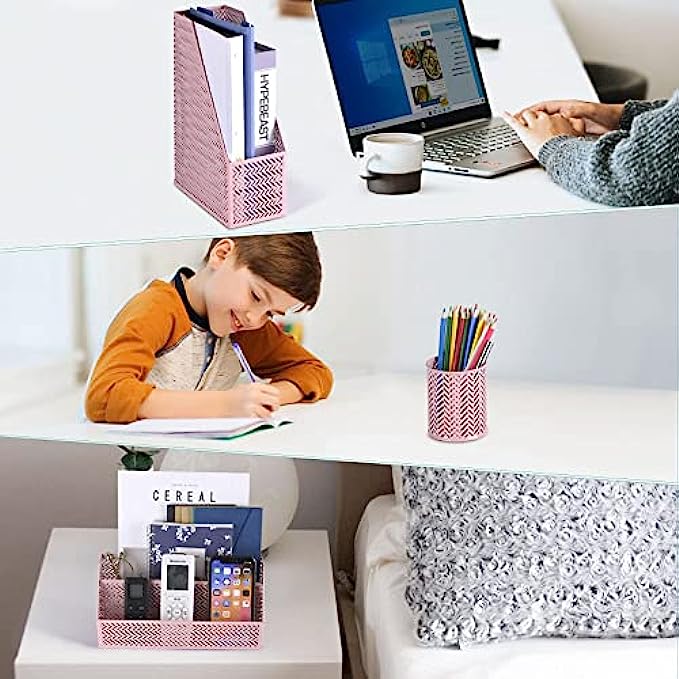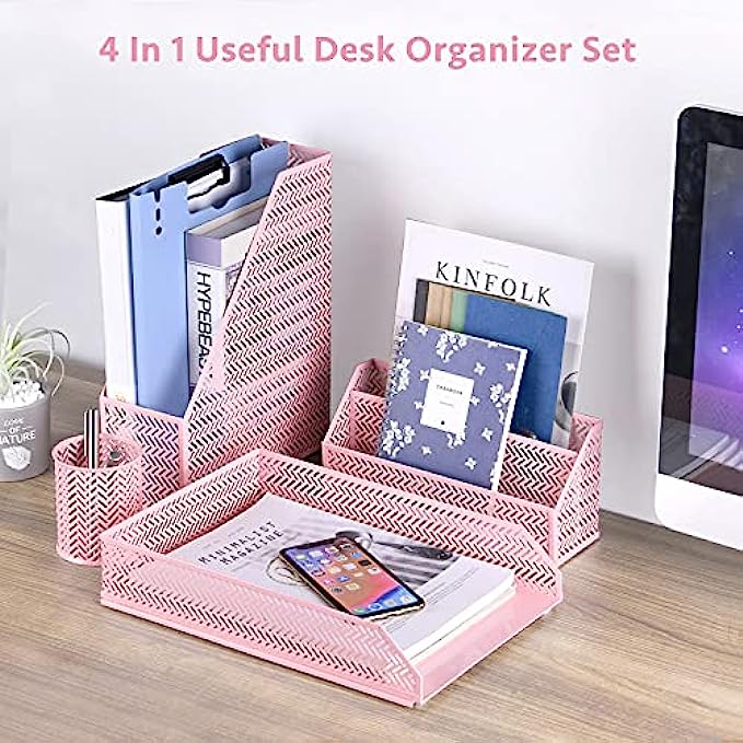 • 【Four Set Office Organziers Combination to Satisfy Your Needs】: You can store all your accessories with cute desktop organizers for office. One pencil cup, Letter Sorter, Magazine Holder and Paper Tray