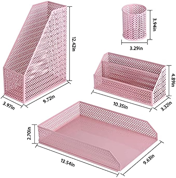 POPRUN Desk Organzier Set Cute Desk Accessories 4 Piece-Letter Sorter, Pen Cup, Magazine Holder and Paper Tray Office Organizer set - Cute Stationary Desktop Accessories for Women Desk Set- Pink