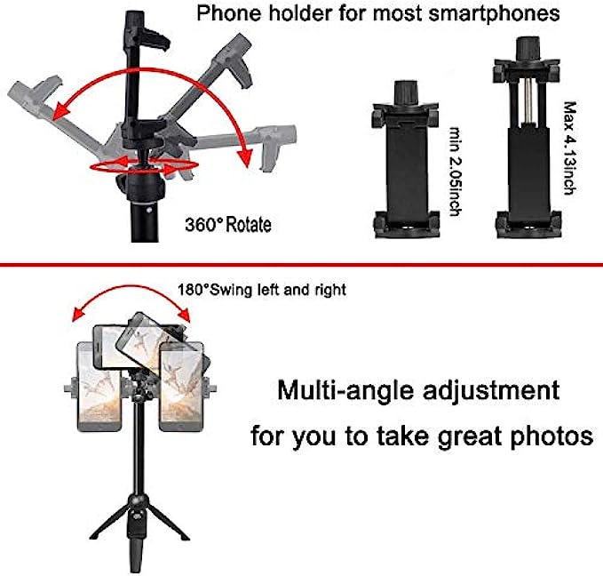 • 【Adjustable Angle and Rotatable Phone Holder】: 360°Rotatable Phone Holder and 180° Rotation Head allow you could take photos, video call or live broadcasting.