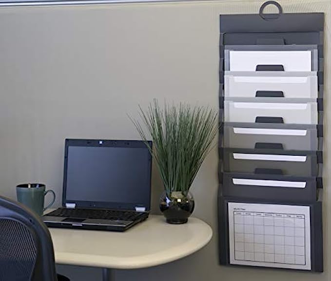 • Includes 1 letter size hanging wall organizer (14-1/4" W x 36-1/4" H when open) with 6 removable file folder pockets in neutral colors, 1 clear front pocket and 1 blank label sheet