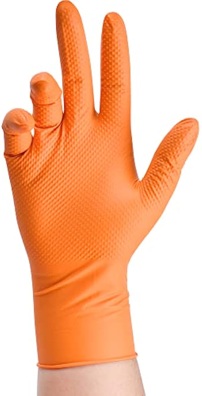 • HIGHLY VISIBLE: The bold orange color makes the nitrile gloves and your hand easily recognizable and alerting even in darker environments, greatly improving safety in heavy-duty tasks such as mechanic, automotive, construction, and manufacturing.