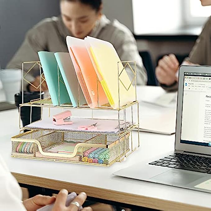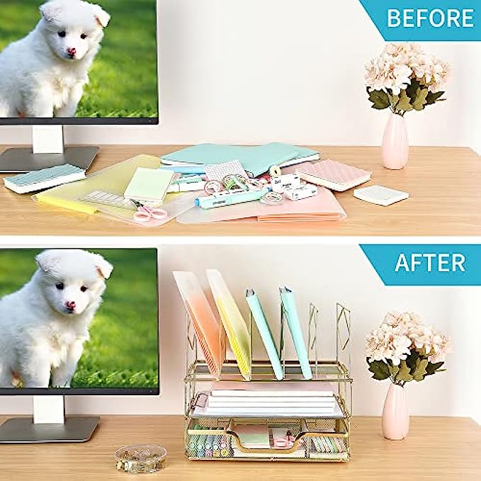 【Space Saving】The double tray with sliding drawer and vertical sorters provide everything you need and makes the most of your vertical and horizontal space. Keep your desk looking tidy at all times.