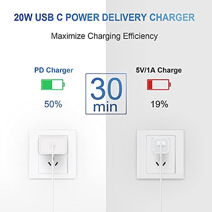 • [Fast Wall Charger]20W PD USB Type C power delivery wall plug, PD adapter 3.0 Quickly Charge USB C port provides Max 20W output power, charge your device up to 3x faster than the original 5 W charger, charging your iPhone up to 50% in just 30 minutes for iPhone Charging, At 3A Maximum, Helps You Work Efficiently.